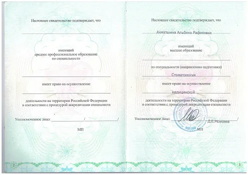 2023 г. — обучилась на курсе «Восстановление толщины костной ткани методом профессора Кюри. Открытый синус-лифтинг».
