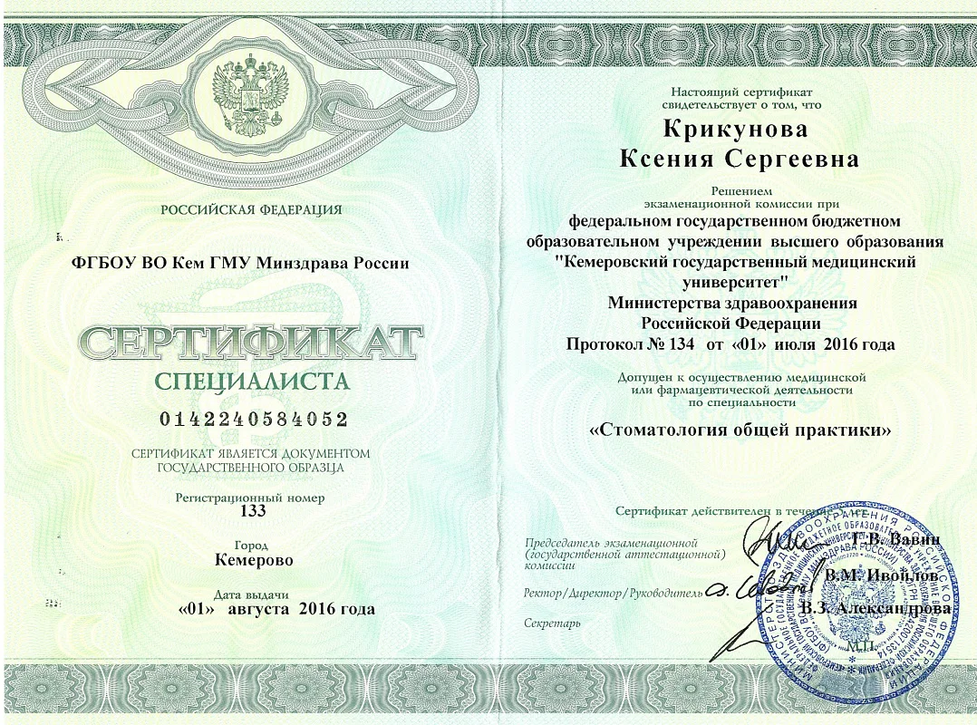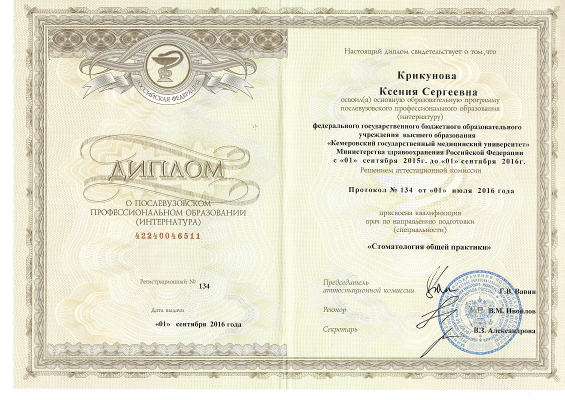 2016г. - ФГБО УВБ Кемеровский государственный медицинский университет интернатура по специальности «стоматология общей практики»