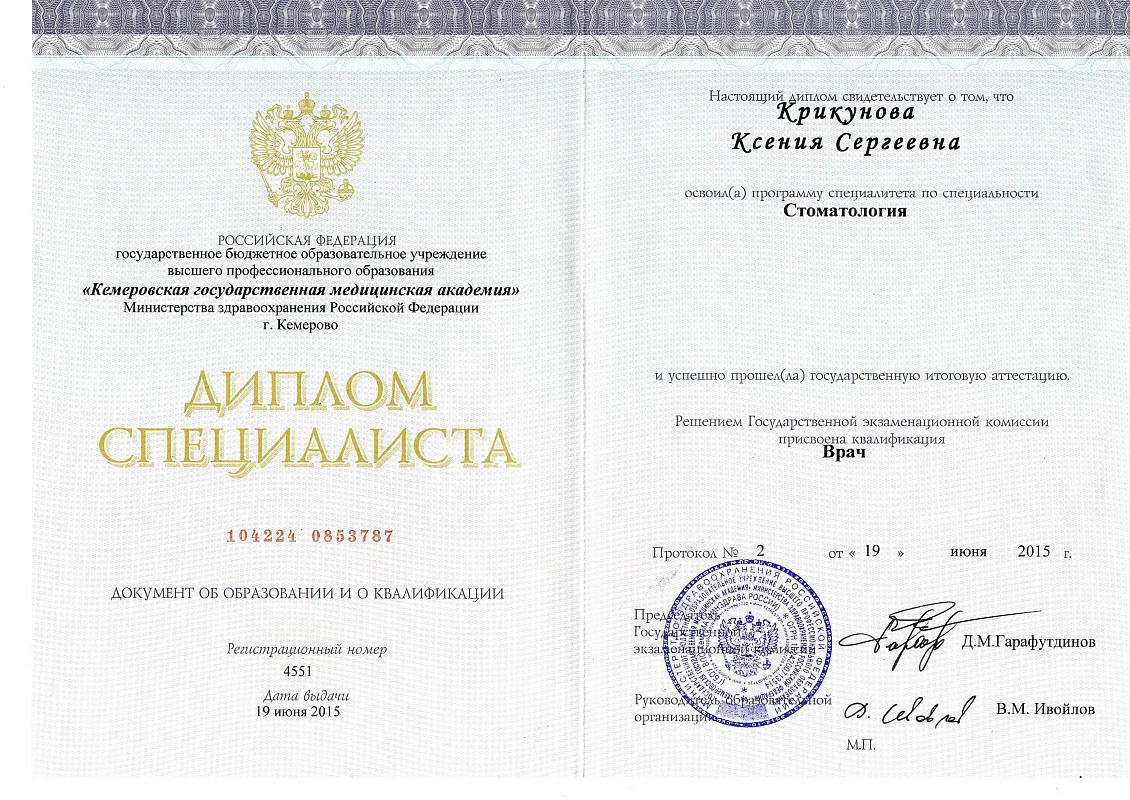 2015г. - ГБОУ ВПО Кемеровская государственная медицинская академия. Специальность: врач стоматолог