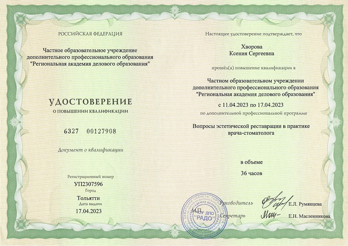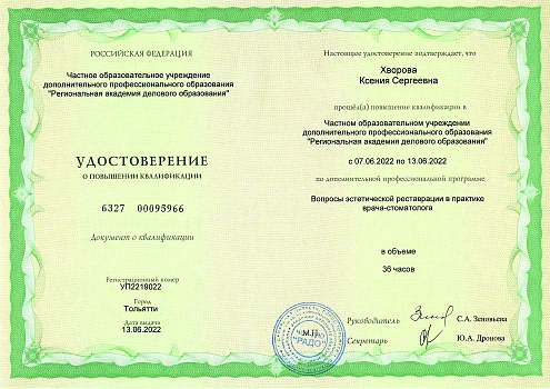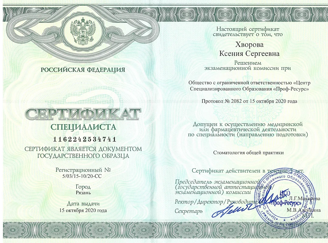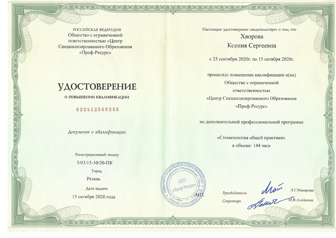 2020г. - ООО «Центр Специализированного Образования «Проф-Ресурс». Профессиональная переподготовка по ортопедической стоматологии
