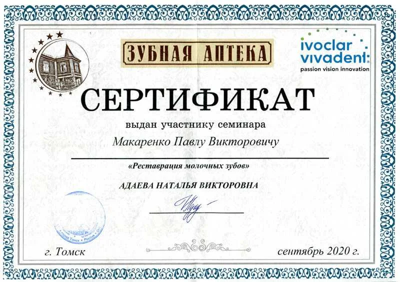 Октябрь 2020год Реставрация молочных зубов – курс Адаева Наталья Викторовна