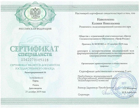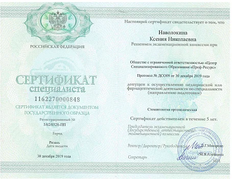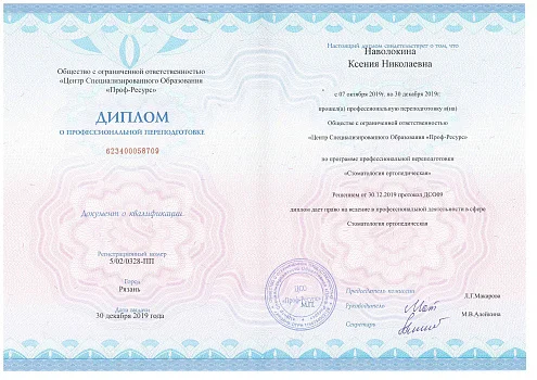 2019 - ООО «Центр Специализированного Образования «Проф-Ресурс». Профессиональная переподготовка по ортопедической стоматологии