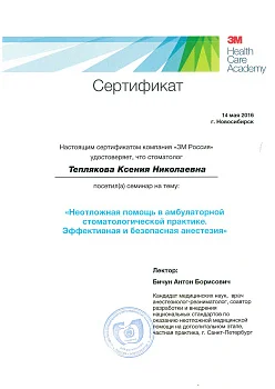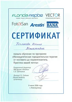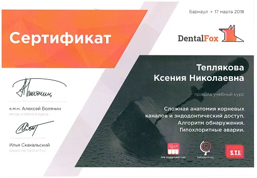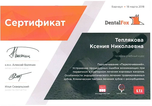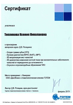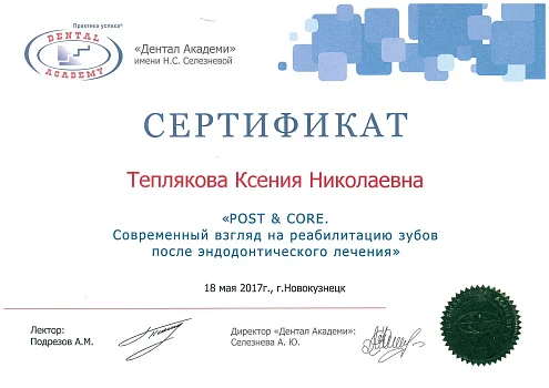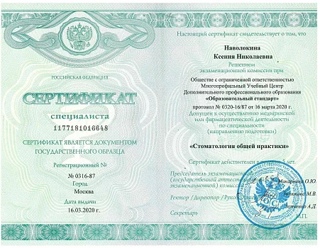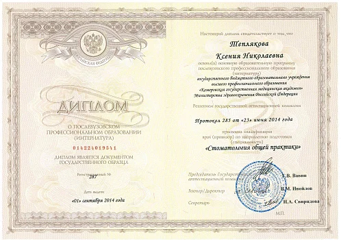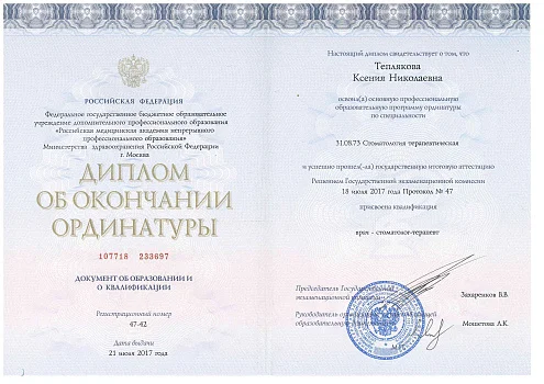 2017 - Федеральное государственное бюджетное образовательное учреждение дополнительного профессионального образования «Российская медицинская академия непрерывного профессионального образования» министерства здравоохранения РФ г. Москва. Ординатура по специальности «Терапевтическая стоматология»