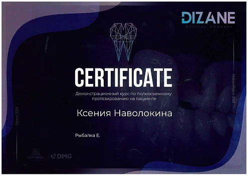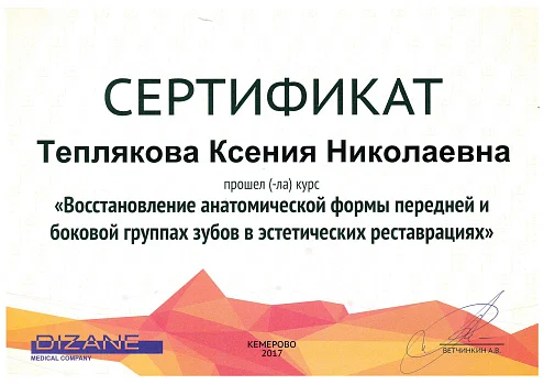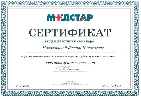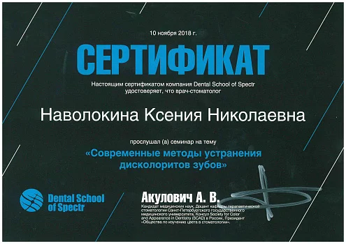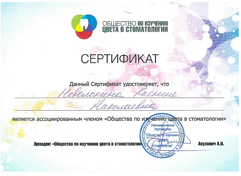 2018 - Сертификат ассоциированного члена «Общества по изучению цвета в стоматологии»