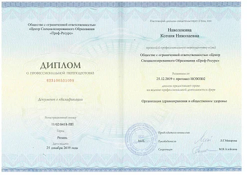 2019 - ООО «Центр Специализированного Образования «Проф-Ресурс». Профессиональная переподготовка по организации здравоохранения и общественному здоровью