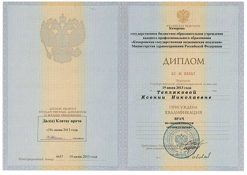 2013 - ГБОУ ВПО Кемеровская государственная медицинская академия. Специальность «Врач стоматолог»